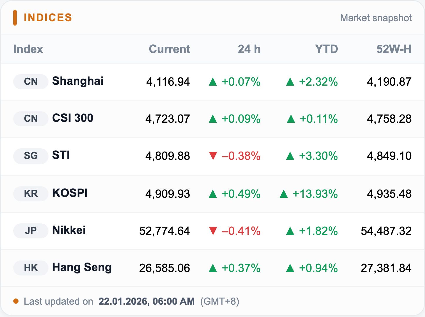 After the Wall Street sell-off, sentiment turns cautious: Trump’s Greenland push and fresh tariff threats are fueling risk concerns. Chip stocks remain relatively resilient across Asia, while banks and industrials slip modestly.