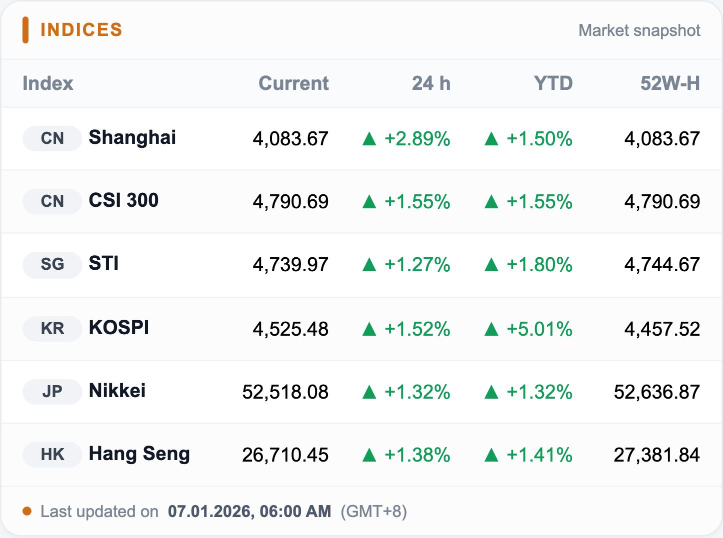 So far in 2026, Asia has known only one direction: up. China is hitting four-year highs, Japan is posting its strongest start to a year since 1990, Korea is chasing record after record, and Singapore has broken the 4,700 mark for the first time.