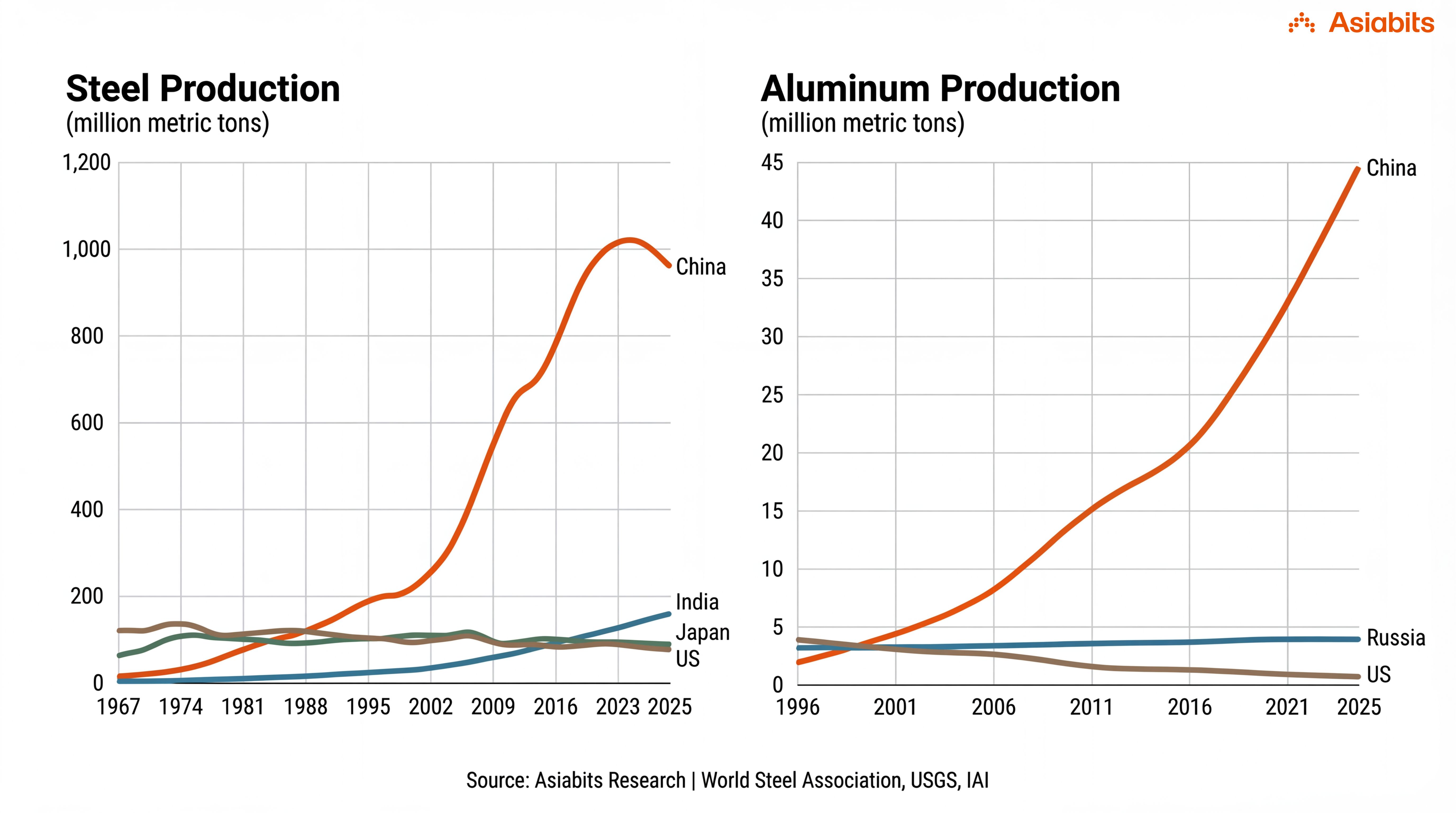 In aluminum, however, China continues to grow: 45 million tons (2025), which is 60% of world production.