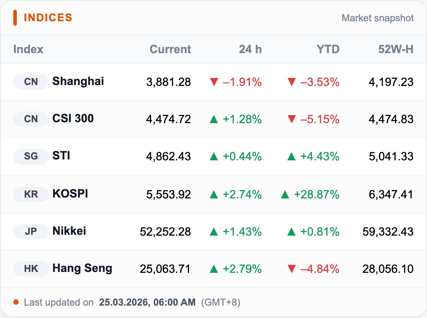 Asia back in rally mode: South Korea's benchmark index surged +4.39%, fueled by a Wall Street rally (Dow +1.38% to 46,208) and de-escalation signals from the Middle East. Hang Seng (+1.6%), Nikkei (+1.1%) and CSI 300 (+0.5%) followed suit, while Brent crude bounced back +3.5% to $103.70.