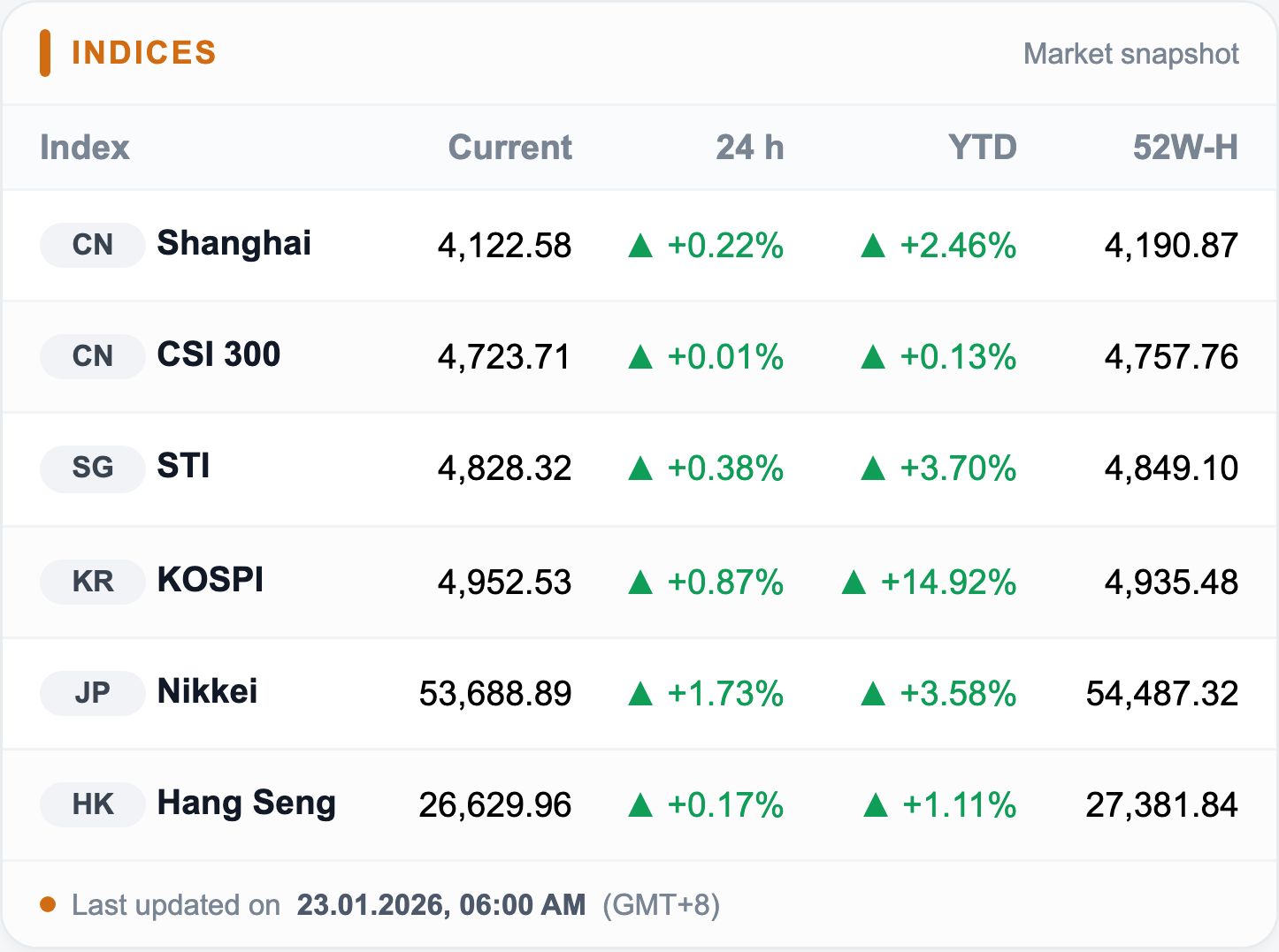 Most regional indices caught the positive vibe from Wall Street and closed in the green.